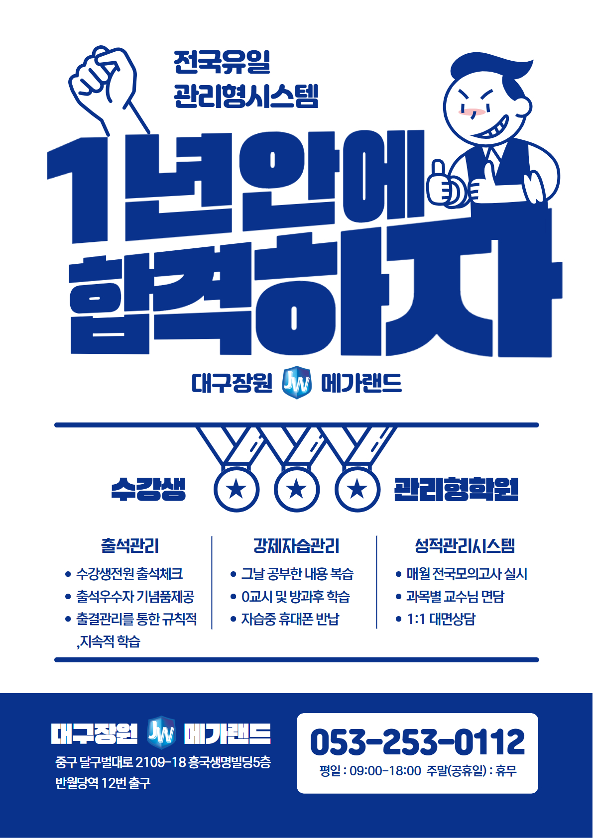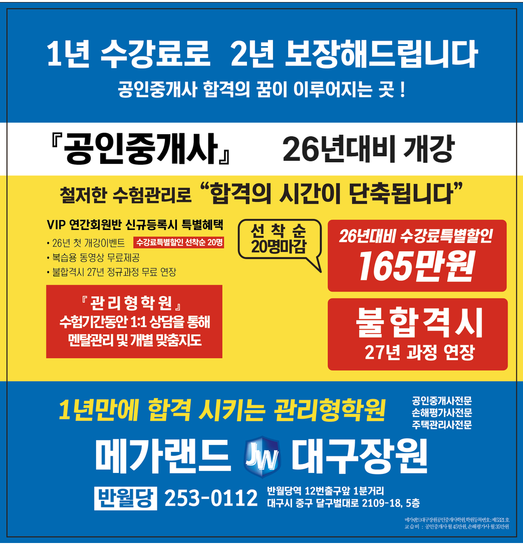 한달, 두달이 아닌 1년 가까이 지내야 할 장소이기에 쾌적하고 깨끗한 학습환경을 제공하고자 합니다. 공부에만 전념 할 수 있도록 여러분의 합격을 위해 노력하는 메가랜드 대구공인중개사학원이 되겠습니다